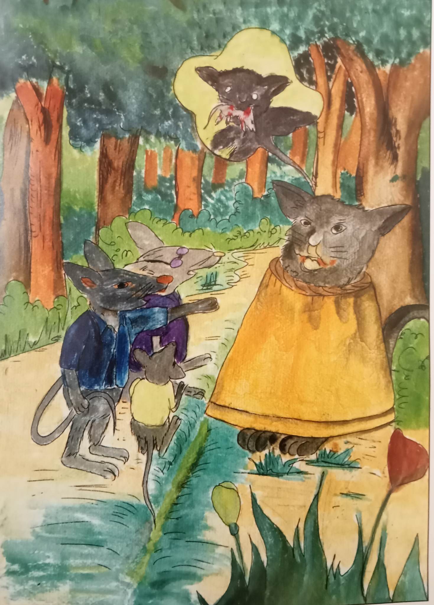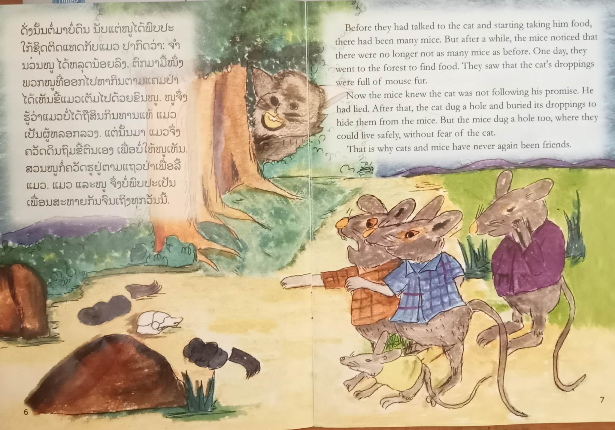 ດັ່ງນັ້ນ, ຕໍ່ມາບໍດົນນັບແຕ່ໜູໄດ້ພົບປະໃກ້ຊິດຕິດແທດກັບແມວ ປາກົດວ່າ:ຈຳນວນໜູໄດ້ຫຼຸດນ້ອຍລົງ,ຕົກມາມື້ໜຶ່ງພວກໜູທີ່ອອກໄປຫາກິນຕາມແຄມປ່າໄດ້ເຫັນຂີ້ແມວທີ່ເຕັມໄປດ້ວຍຂົນໜູ.ໜູຈຶ່ງຮູ້ວ່າແມວບໍ່ໄດ້ຖືສິນກິນທານແທ້ແມວເປັນຜູ້ລອກລວງ.ແຕ່ນັ້ນມາແມວຈຶ່ງຄວັດດິນຖົມຂີ້ຕົນເອງເພື່ອບໍ່ໃຫ້ໜູເຫັນ.ສ່ວນໜູກໍ່ຄວັດຮູຢູ່ຕາມແຖວປ່າເພື່ອລີ້ແມວ.ແມວ ແລະ ໜູຈຶ່ງບໍ່ພົບປະເປັນເພື່ອສະຫາຍກັນຈົນເຖິງທຸກວັນນີ້.